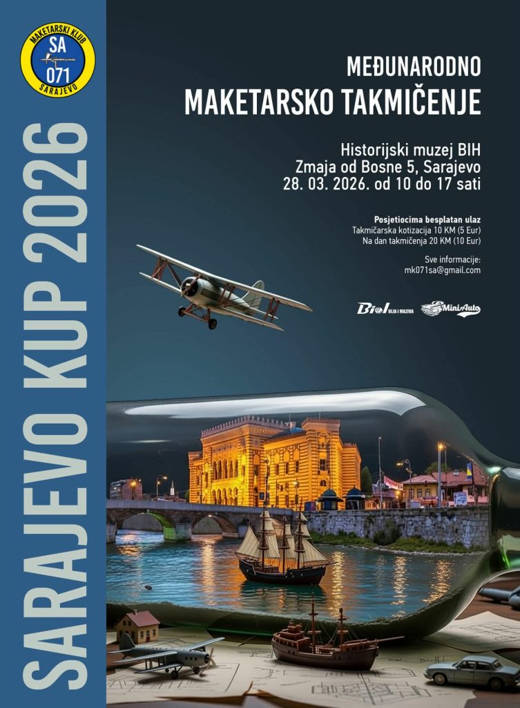Ne propustite priliku da vidite kako izgleda prvo međunarodno takmičenje “Sarajevo Kup 2026”, koje će biti održano 28. marta 2026. u Historijskom muzeju u Sarajevu. Dođite, uživajte u svijetu maketa i podržite mlade talente koji već osvajaju međunarodne nagrade.