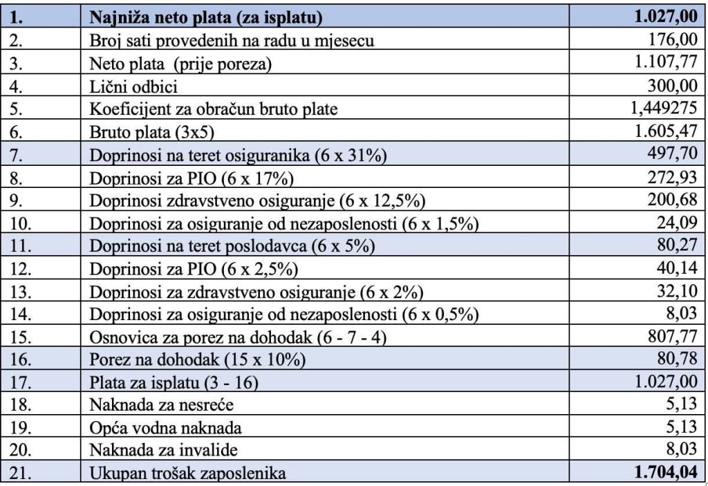 U tabeli ispod možete vidjeti detaljan obračun minimalne plate, uključujući bruto iznos, doprinose, poreze i ostale obavezne stavke koje čine ukupni trošak jedne plate.