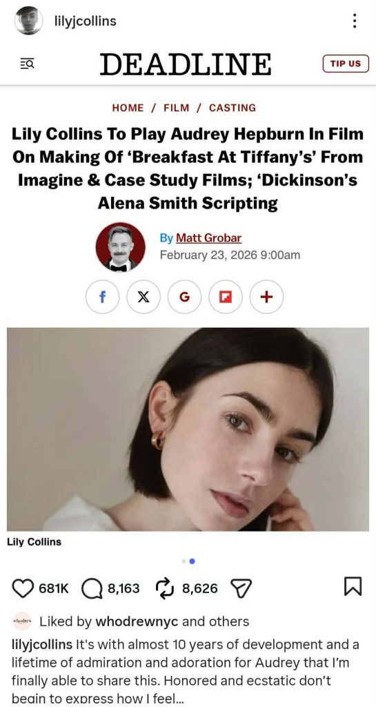 U glavnoj ulozi, kao Audrey Hepburn, legendarna glumica koja je originalno tumačila Holly Golightly, biće Lily Collins, zvijezda serije Emily in Paris i svjetski popularna glumica koja je dugo izražavala divljenje Hepburninoj karijeri. Collins je lično potvrdila angažman na društvenim mrežama, govoreći da je projekt rezultat ponajmanje deset godina razvoja i njene duboke fascinacije Hepburninom umjetnošću i naslijeđem.