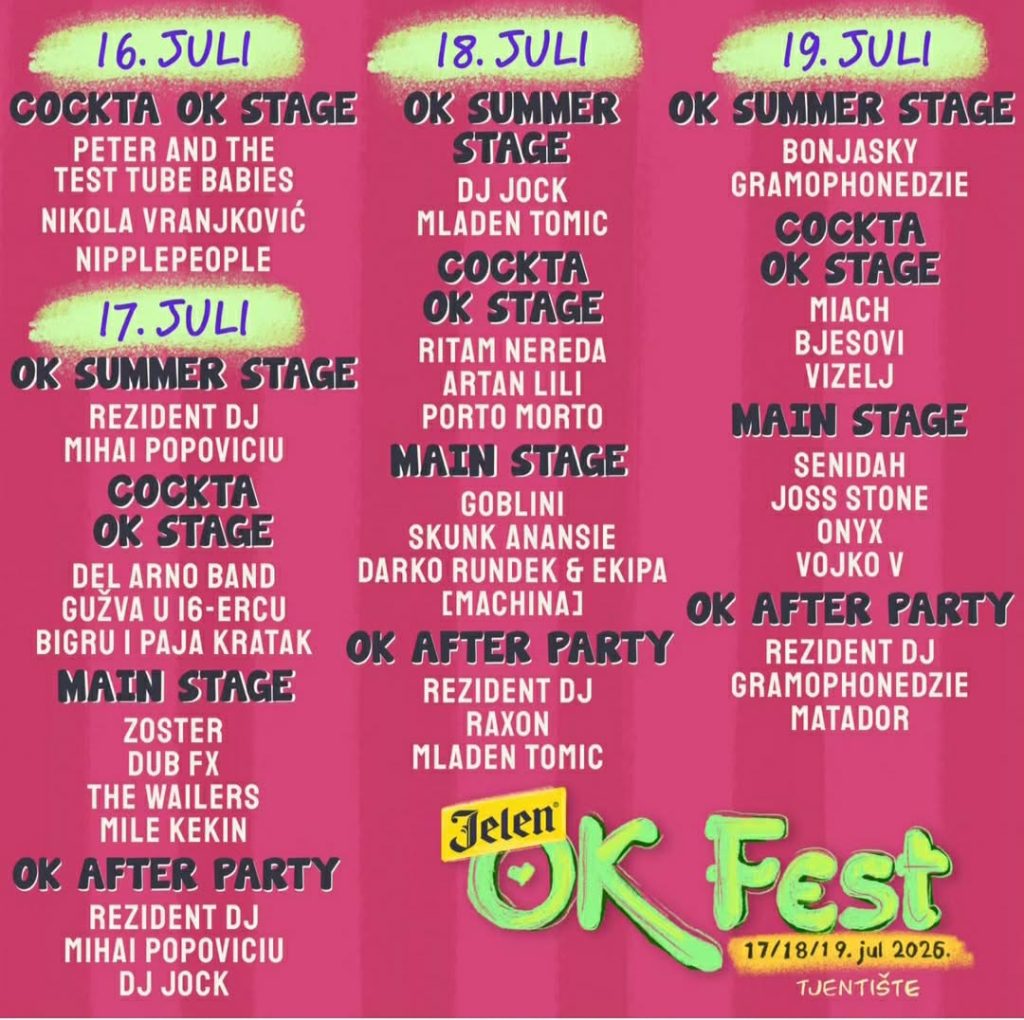 OK Fest i ove godine okuplja pažljivo odabrana imena regionalne scene, donoseći raznolik i snažan muzički program. Među izvođačima koji će obilježiti ovogodišnje izdanje su Zoster, Ritam Nereda, Goblini, Darko Rundek, Senidah i Vojko V, uz brojna druga imena koja će dodatno obogatiti festivalsku atmosferu.