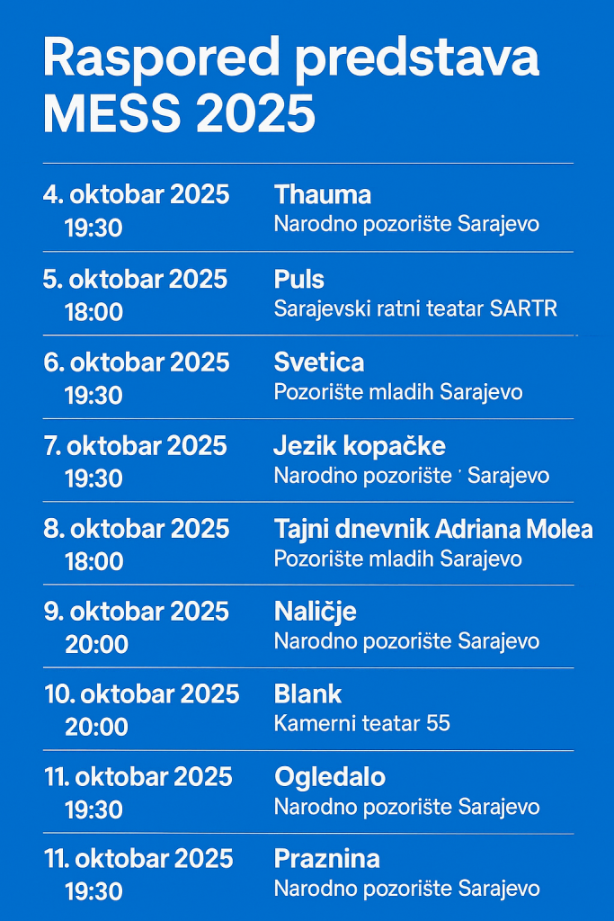 Od 4. do 11. oktobra 2025. godine, Sarajevo će biti domaćin 65. izdanja Internacionalnog teatarskog festivala MESS, najprestižnijeg teatarskog događaja u jugoistočnoj Evropi. Ovaj festival, osnovan 1960. godine, poznat je po predstavljanju najnovijih i najinovativnijih teatarskih produkcija sa svih kontinenata. Ovogodišnje izdanje donosi bogat i raznovrstan program, koji uključuje takmičarske predstave, premijere, te programe posvećene mladima i djeci.